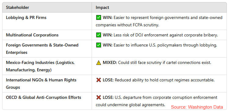 Mexico-facing industries—logistics, infrastructure, and automotive—may face new risks, as bribery cases linked to cartel influence could still be prosecuted.